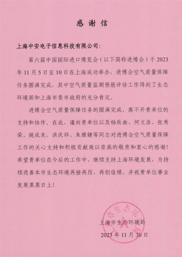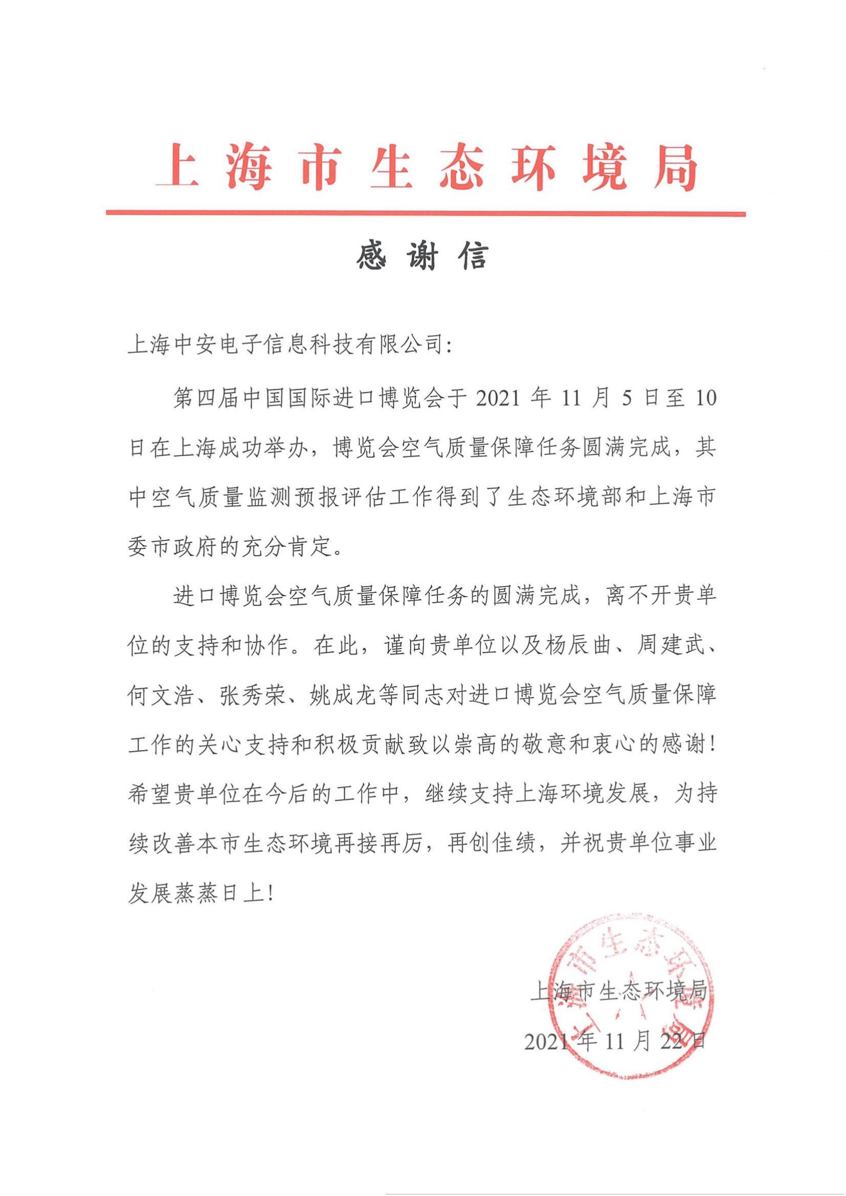 上海環(huán)監(jiān)中心就中安科技在21年國際進(jìn)博會空氣質(zhì)量監(jiān)測預(yù)報工作中杰出貢獻(xiàn)送來感謝信!(2021/12/31)